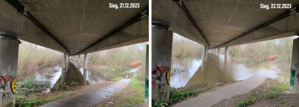 Die Bilder zeigen eindrucksvoll den starken Anstieg der Sieg binnen 24 Stunden.