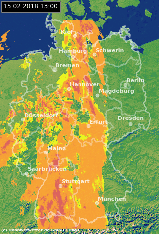 In den frühen Nachmittagsstunde betreffen teils kräftige Schneefälle vor allem Teile Schleswig-Holsteins und Mecklenburg-Vorpommerns. Winterliche und somit verkehrsbeeinträchtigende Witterungsverhältnisse sind weiterhin in den mittleren Landesteilen, hier vor allem im Südosten Niedersachsens sowie in Sachsen-Anhalt und Thüringen zu erwarten. Ebenso muss in Bayern und Baden-Württemberg mit kräftigen Schneefällen gerechnet werden.
