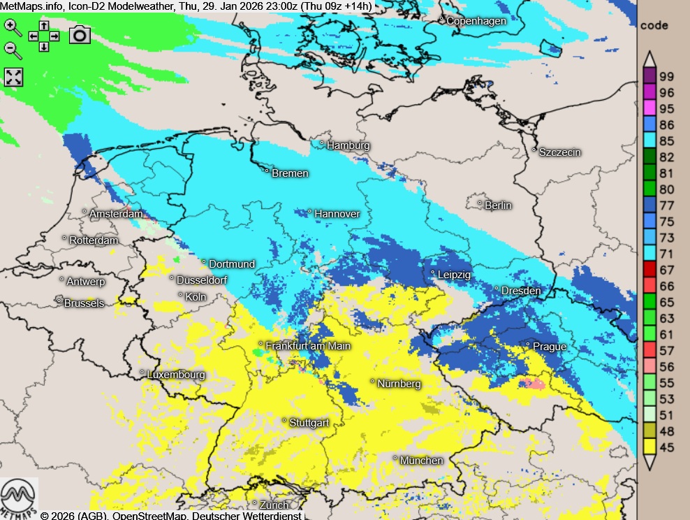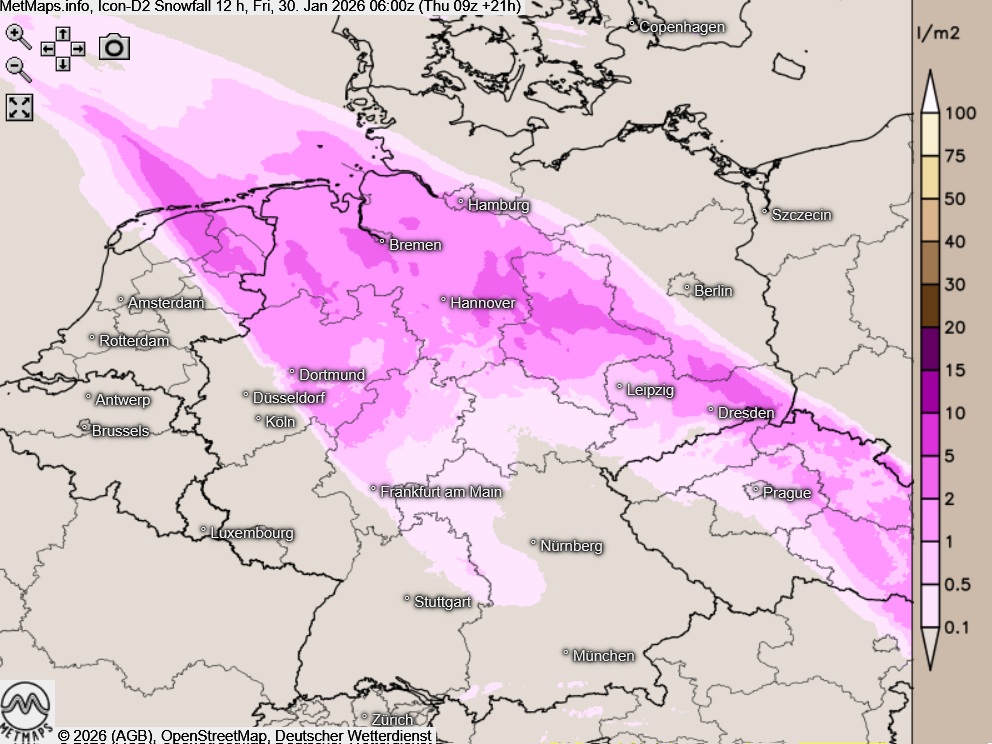 Auch in den Abendstunden sowie in der Nacht zum Freitag muss auf einem breiten Streifen vom Nordwesten über die Mitte bis nach Sachsen mit lokalem Schneefall gerechnet werden. Zudem besteht von allem südwestlich des Schneegebiets erhöhte Glättegefahr durch überfrierende Nässe.