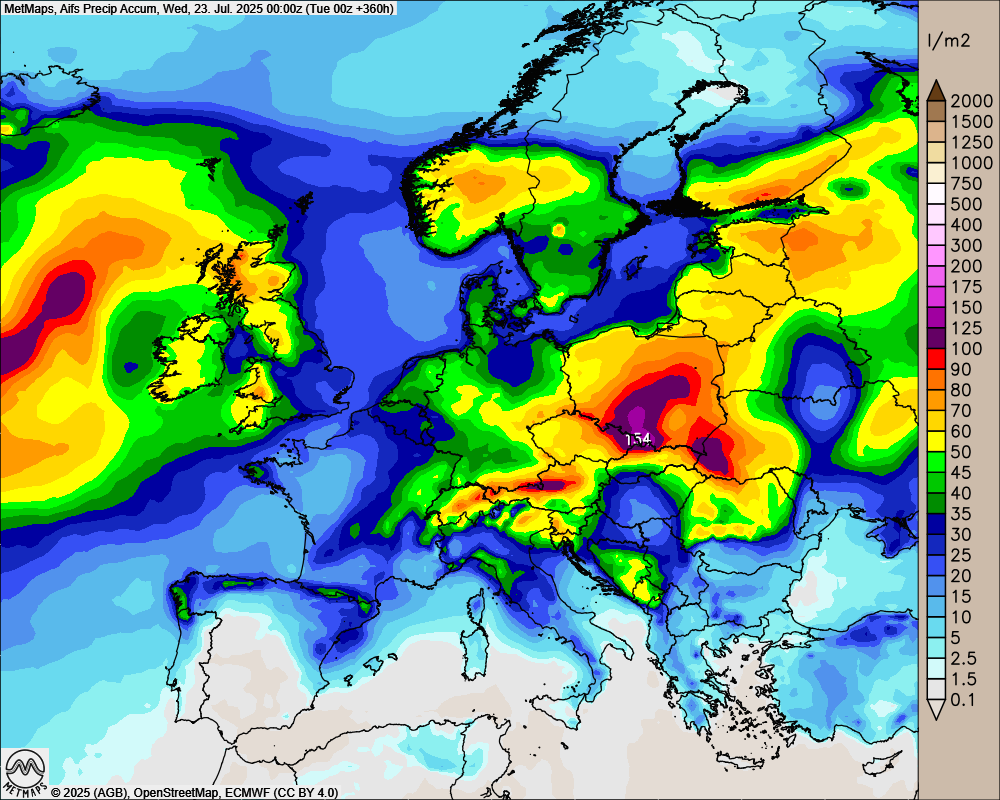 Gut erkennbar ist sind die anfänglichen Wetter- und Niederschlagsgegensätze auf der folgenden Prognosekarte, welche die akkumulierten Niederschlagssummen bis zum 23.07.2025 abbildet.
