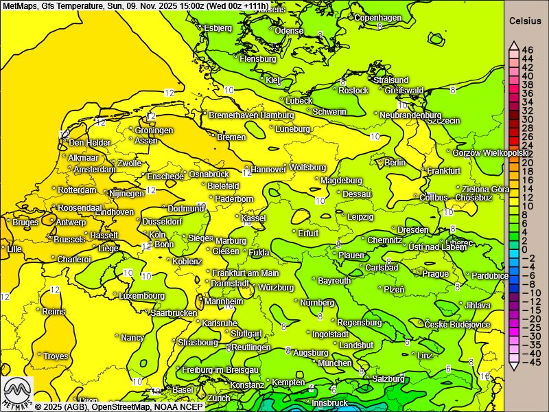 Zwar wird eine schwache Wetterfront die Temperaturen zum Wochenende etwas absinken lassen, die Gesamtlage bleibt aber stabil. Tagsüber liegen die Temperaturen am Wochenende dann verbreitet bei Werten um 10 bis 13 Grad (s. GFS-Karte für Sonntag), nachts geht es runter auf frische 5 bis 0 Grad.
