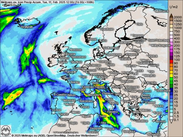 Sehr schön ist das auch an den Regensummen nach ICON bis Dienstag zu sehen (s. Karte unten): Westlich und südlich von uns fällt zum Teil ergiebiger Regen, in Zentral- und Osteuropa bleibt es dagegen bei absinkender Luftbewegung niederschlagsfrei.