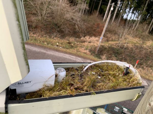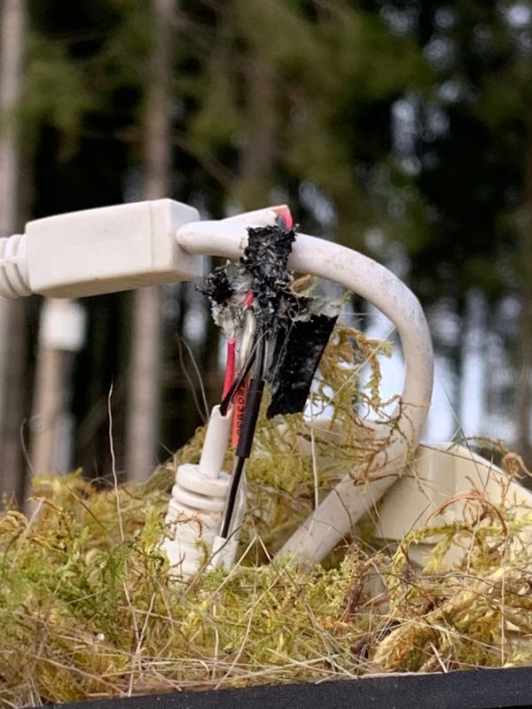 Natürlich nicht: Die Gehäuseöffnungen, die dem Feuchtigkeitsaustausch dienen, eignen sich anscheinend hervorragend als Vogelnest-Entree. Als die gefiederten Bewohner dann irgendwann flügge wurden, hat, zumindest den Hinterlassenschaften zu urteilen, vermutlich eine Mäusefamilie das Heim bezogen. Als bequeme Nahrungsquelle vor Ort diente die Kameraverkabelung.
