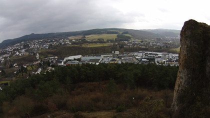Die Aufnahme von den Gerolsteiner Dolomiten mit unserer Wetterdrone bei starker Bewölkung und etwas Regen. Dieses 380 Millionen Jahre alte Riff ist in einem subtropischen Meer entstanden. Heute trotzt es dem gar nicht so milden Märzregen.