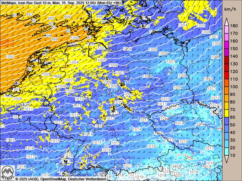 Die 12-Stunden-Regensummen bis Montagnachmittag (15:00 Uhr) nach ICON-RUC: