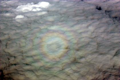 Heiligenscheine, Kränze und Glorien sind faszinierende Phänomene, nicht nur für die katholische Kirche. Die Farbenspiele sind recht häufig bei Wolken zu beobachten, die überwiegend aus Wassertropfen bestehen. Während sich Kränze um Sonne und Mond mit farbigen Ringen bilden, ist die Glorie ein Phänomen auf der sonnenabgewandten Seite des Flugzeuges.