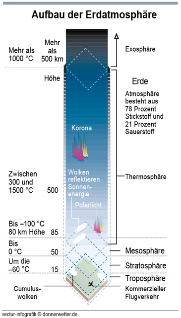 Aus unterschiedlichen Schichten besteht unsere "Erdhülle" - in welcher Höhe welche Schicht zu finden ist und welche Temperaturen dort herrschen, haben wir für Sie in unserer Infografik nochmals veranschaulicht: